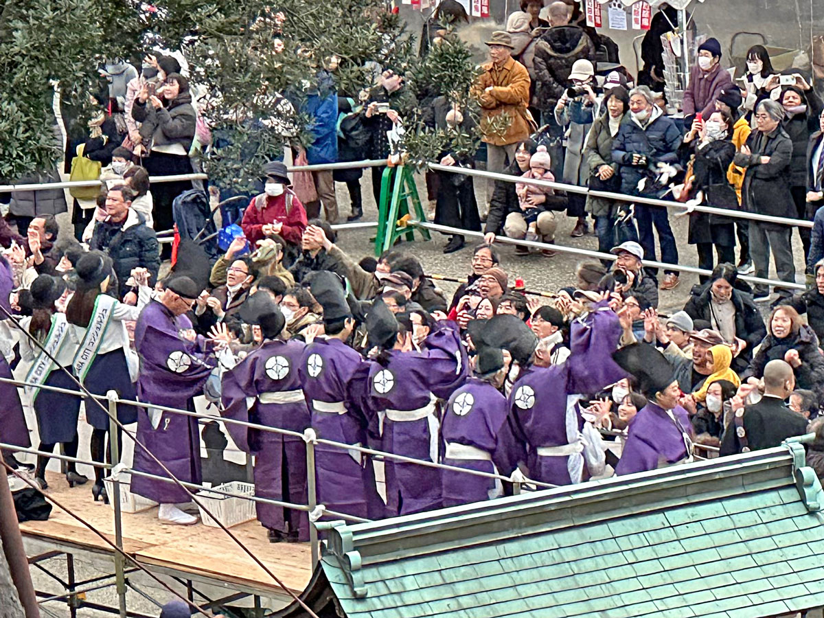 その後、特設ステージに並ばれて掛け声と共に袋詰めされた福豆、福鈴、ピーナッツ、お菓子などがまかれました。